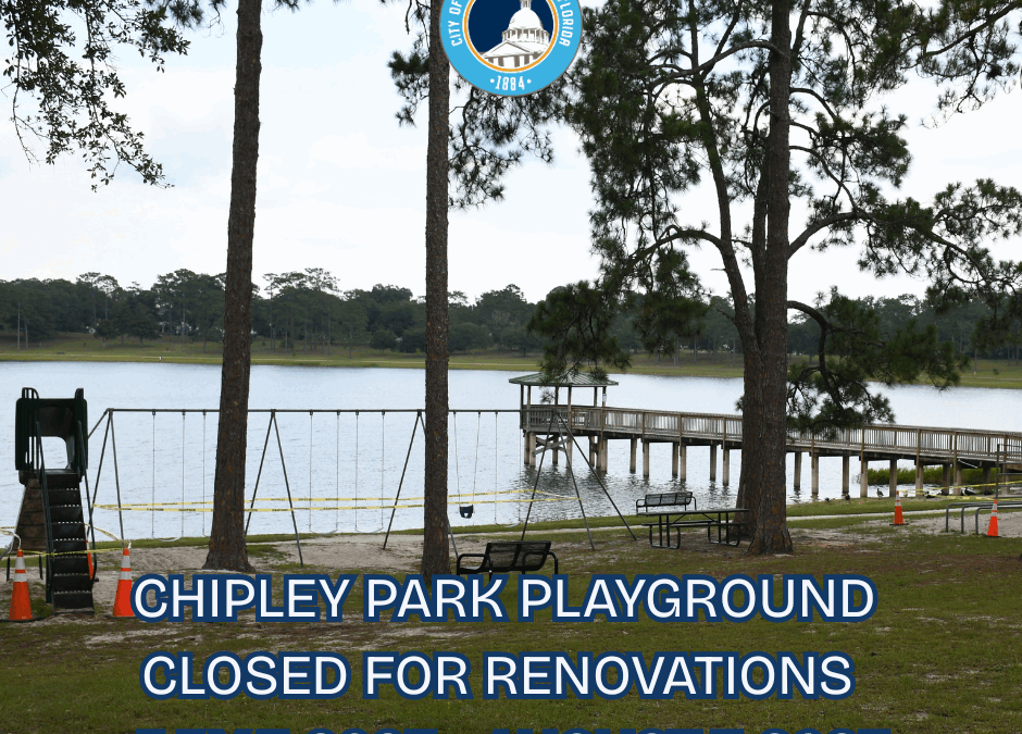 Chipley Park Playground at Lake DeFuniak is temporarily closed to the public beginning today, Monday, July 7, 2025, as we undertake important playground renovations. This project involves removing the old playground equipment and replacing it with modern, safe, and engaging play structures for children. We anticipate that the park will remain closed until the first week of August as we work to enhance the playground experience for our community. Thank you for understanding, and we look forward to welcoming everyone back to enjoy the new improvements! Any questions or concerns, contact the City of DeFuniak Springs Public Works Department at 850-892-8534.