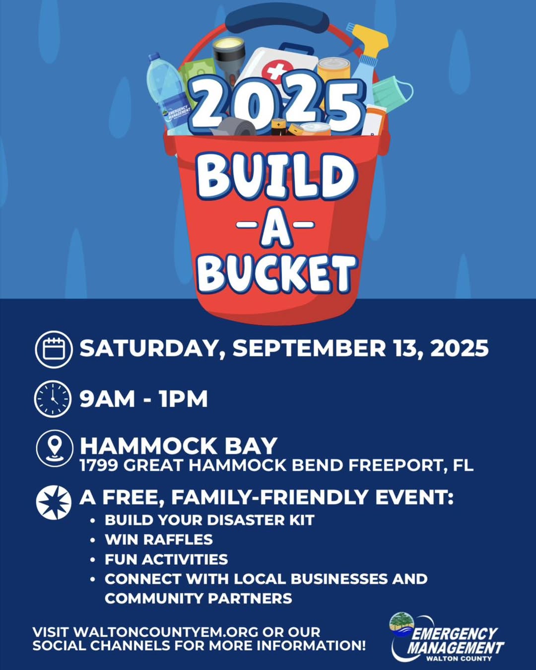 In honor of National Preparedness Month, Walton County Emergency Management is hosting a Build-A-Bucket event on September 13 from 9 AM to 1 PM at Hammock Bay in Freeport.