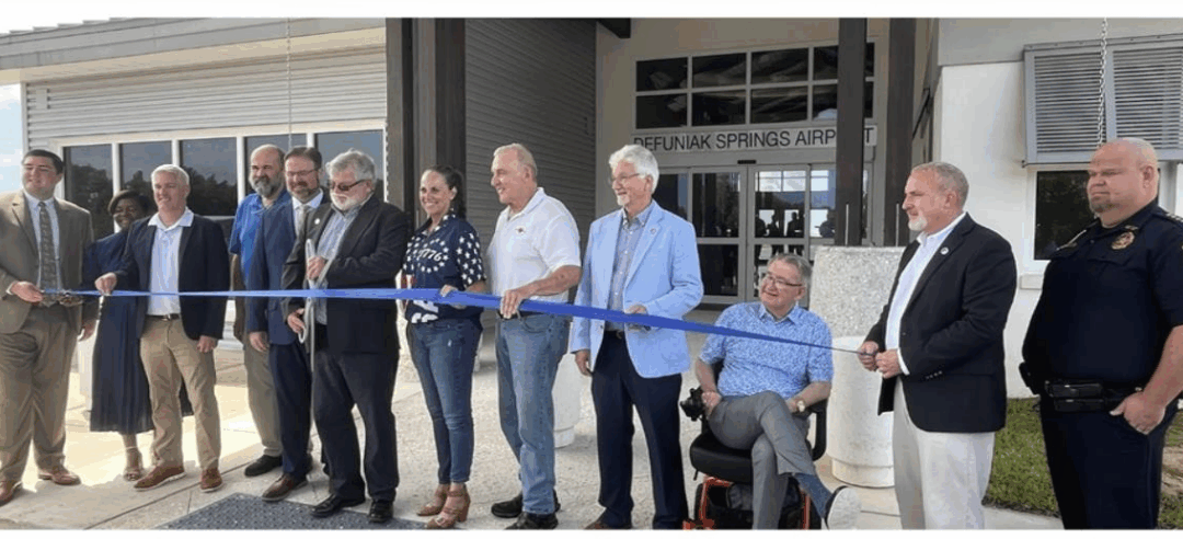 County officials joined DeFuniak Springs city officials, Florida Representative Shane Abbott, former Florida Senator George Gainer, and other state and local dignitaries for a ribbon-cutting ceremony at the DeFuniak Springs Municipal Airport.